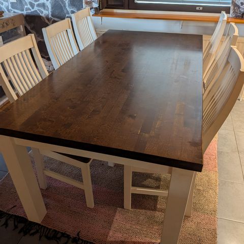 Pohjanmaan classic ruokailuryhmä kahdeksalla tuolilla. Tukeva ja massiivinen. Väri tumma pähkinä. Pientä käytön jälkeä löytyy pöydästä ja joistain tuoleista. Tuoleissa tumman harmaa kangasverhoilu. Yleisilmeeltä siisti kokonaisuus.