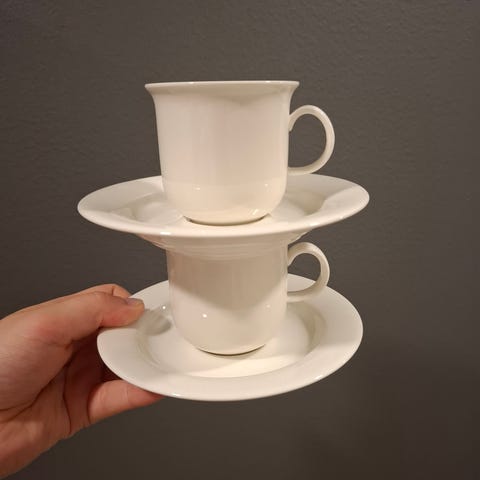 Kuusi kuppia (1dl) tasseineen sekä sokerikko ja kermakko.