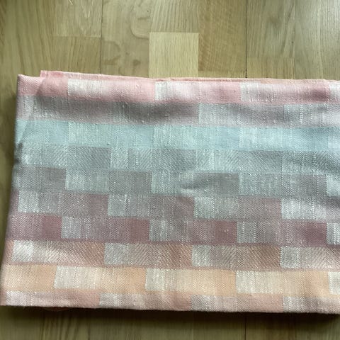 Pyöristetyt kulmat. Koko 200 x 250 cm, reunapitsin leveys 24 cm. Näyttäs pellavalta. Iästä ei tietoa.