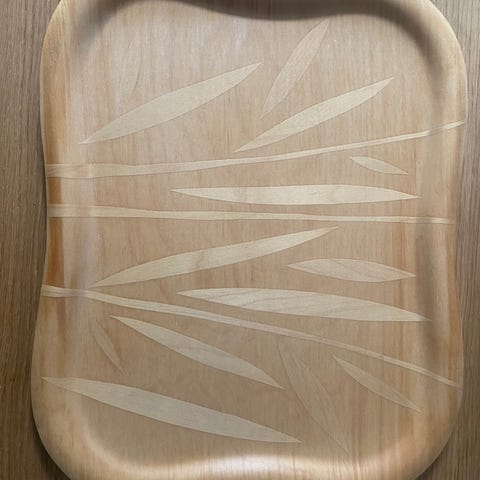 Nikarin valmistaman tarjottimen Alvar Aalto suunnitteli alun perin Seinäjoen seurakuntakeskukseen 1960-luvulla. Myynnissä oleva tarjotin on uustuotantoa. Koivua ja valkoista laminaattia. Pituus 57 cm, leveys 33cm, korkeus 4 cm. Oikein hyviäkuntoinen, ei erityistä huomautettavaa. Alkuperäinen pakkauslaatikko.