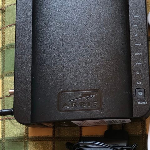 Arris TG2492S modeemi tietoliikenneverkkoon. Laite sisältää useita liitäntöjä verkkokaapeleille. Käytettävissä verkkoyhteyksien hallintaan ja internet-yhteyden jakamiseen.