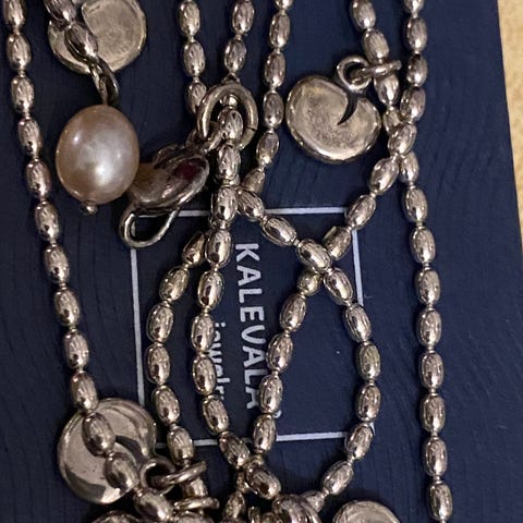 Muutaman kerran käytetty vanamo kaulakoru 80cm. Korussa on hopeinen ketju ja koristeena helmet. Mukana laatikko. Voi käyttää pitkänä tai kaksinkerroin. Vain haku.