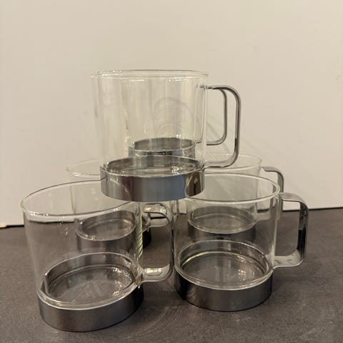 Mukit ovat läpinäkyvää lasia, joissa on metallinen alareuna.