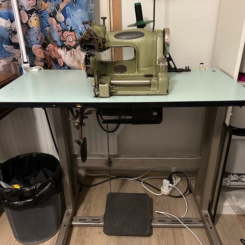 Strobel 140-L merkkinen turkis-ja nahkaompelukone. Kiinni pöydässä, pöydän koko leveys 110 cm ja syvyys 54 cm. Kone vaatii öljyntäytön. Nouto Haarajoki/Etelä-Mäntsälä