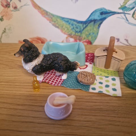 Schleich mopsi, Picnic viltti ja kori, ruokakippa, luu, koiran peti ja pallo, lautanen, piirakka, limsapullo