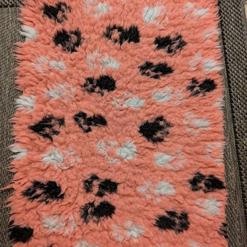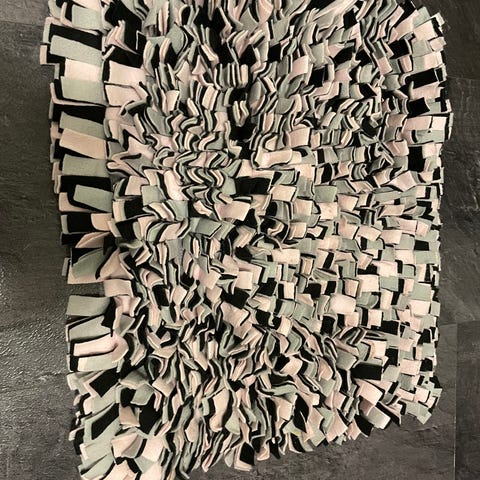 Kuvanmukainen aktivointi-/nuuskumatto koiralle. Koko noin 30 x 40 cm. Matto on tehty liukuesteverkolle kangaspalojen suikaleista. Kangaspalojen materiaali trikoota, joista ei pitäisi irrota kangaskuituja. Jonkin verran myös collegevaatteen materiaalia, joista saattaa irrota kangaskuitua. Nouto tai postitus, myös ToriDiili -lähetys käy.