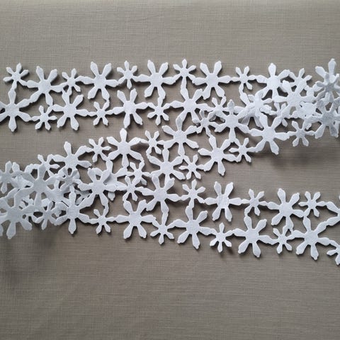 Kuusi uutta, jouluista, valkoista tähden muotoista koristetta.