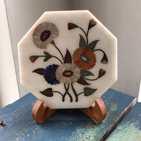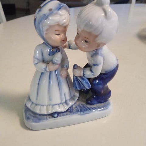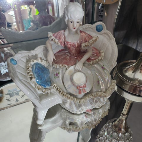 Koriste-esine, jossa on tyttö istumassa aasilla. Esine on värikäs ja valmistettu keraamisesta materiaalista.