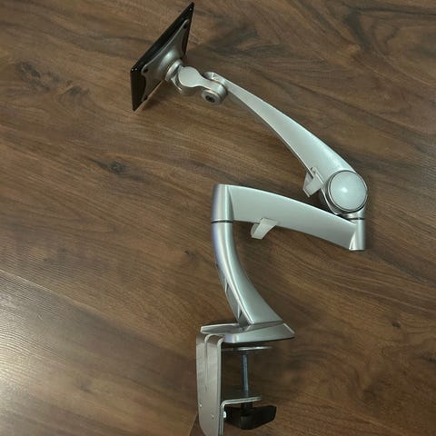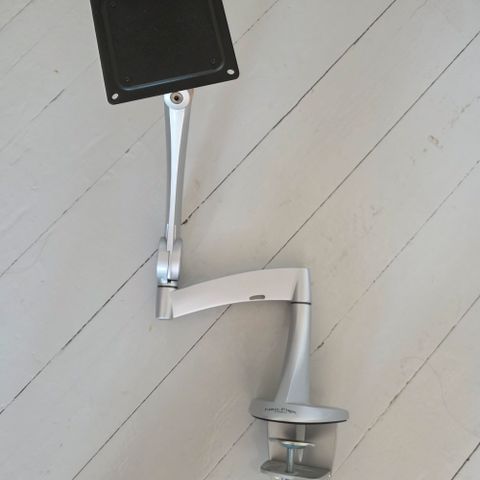 Ergotron monitorin kiinnike, jossa säädettävä varsi. Kiinnike on valmistettu metallista ja muovista, väriltään hopea. Sopii näyttöjen kiinnitykseen työpöydälle, tai seinälle myös pienelle televisiolle.