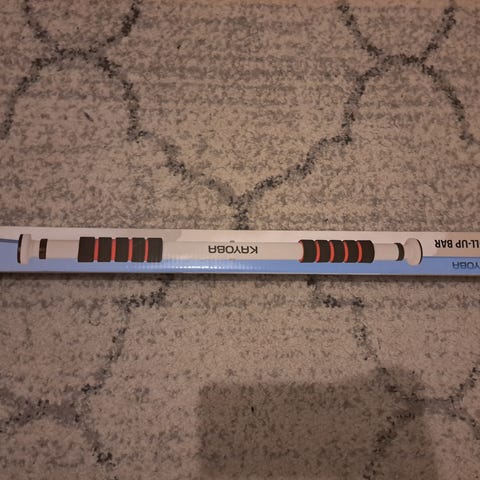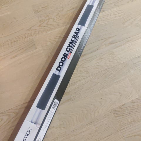 Voimistelutuotteen valkoinen puinen leuanvetotanko 80cm oviaukkoon. Mukaan puiset kannakkeet ja asennusohjeet.