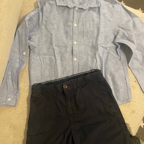 Yhdesti käytetyt, uudenveroiset juhlavaatteet. Valkoinen kauluspaita ja tumman siniset vetoketjulliset juhlahousut molemmat kokoa 134.