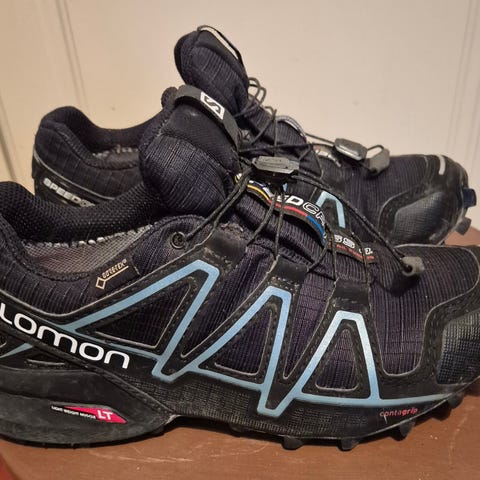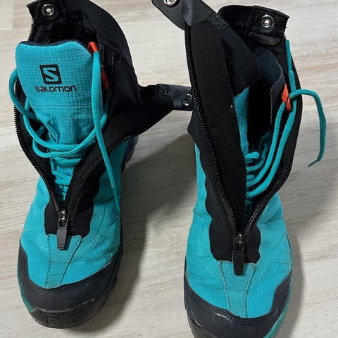 Laadukkaat ja tukevat Salomonin gore-rex retkeily- ja patikointikengät kokoa 38 (sisämitta 23.5cm). Jo ostaessa omaan jalkaan aavistuksen naftit, siitä syystä vähän kävellyt vaelluskengät. Käytetty pääasiassa silloin tällöin moottoripyörän kyydissä. Neljännessä kuvassa näkyy käytönjäljet, jotka tulleet kuumasta pakoputkesta ja karheiden mp-housujen aiheuttamasta kulumasta varteen. Nyt edullisesti pois viemästä tilaa.