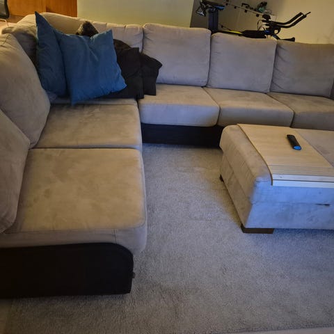 Siistinä pidetty kulmasohva. Divaani osan pituus 225cm toinen osa 203cm kiinnitettynä divaani osaan 294cm. Istuin kork 40cm syv 70cm. Pinta tukevaa kangasta. Kaikki päälliset mahdollisuus irrottaa. 8 tyynyä. Omat kantajat. Liian iso omaan yksilön.