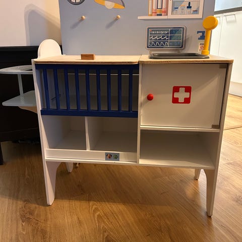 Todella monipuolista leikkiä mahdollistava eläinlääkäriasema. Toisella puolella odotustila, sivussa korkkitaulu (ja 2 nastaa), toisella puolella tutkimushuone, jossa avattavia laatikoita, tutkimuspöytä ja 2 ovellista koppia eläinten säilytykseen. Paljon leikkiesineitä mukana, kuten stetoskooppi, vaaka, eläimenruokaa, lääkkeitä, hoitokaulus, röntgenkuvia, sidostarvikkeita jne.