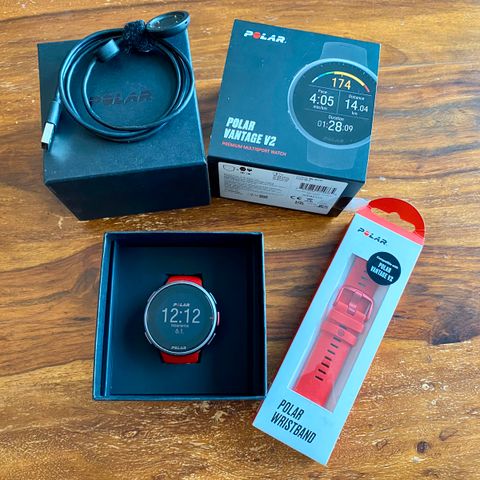 Polar Vantage V2 urheilukello, latausjohto ja uusi punainen ranneke