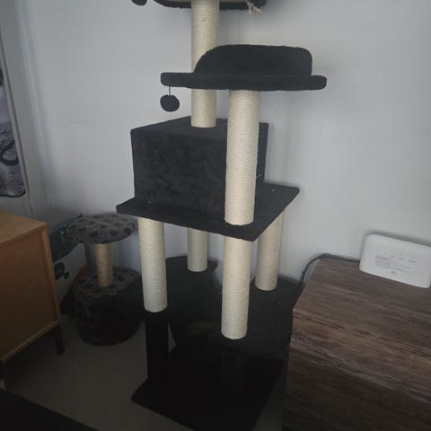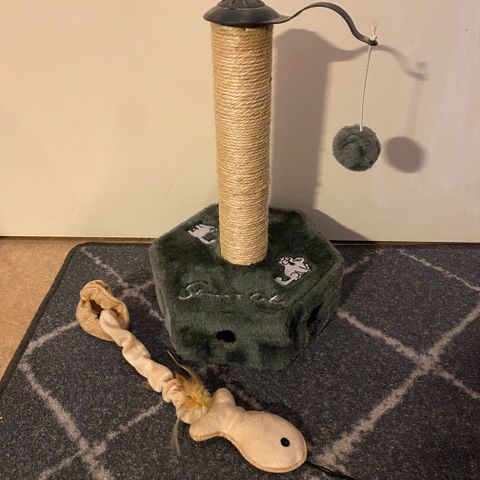Kissan raapimispuu. Tukeva taso ja siisti nukkumapaikka isolle kissalle. Tolpat vaativat fiksausta.