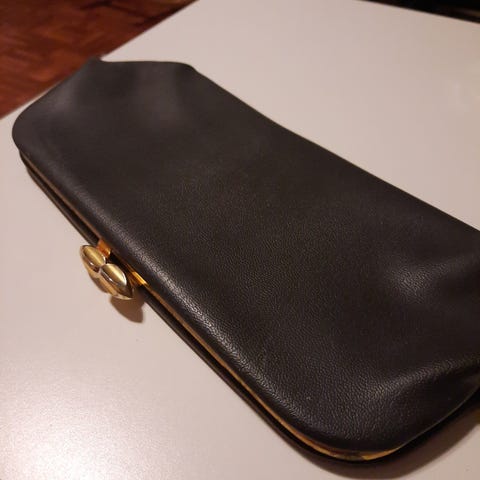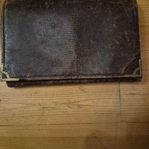 Koko 13x15. Materiaali ehkä käärmeen nahkaa. Ehkä 1900 luvun alusta.