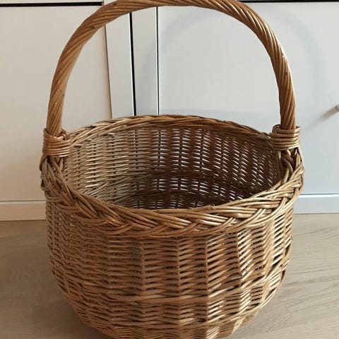 Käsintehty pyöreä bambukori. Jäänyt nyt käyttämättömäksi. Kissatalous, kuvassa näkyy miten yksi punos vähän repsottaa, ei vaikuta korin kestävyyteen tai käyttöön.