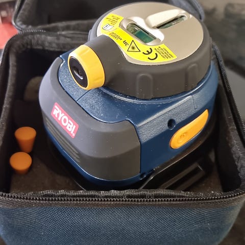 Ryobin laservesivaaka ja jalka. Akku ja laturi mukana, sekä säilytyskotelo.