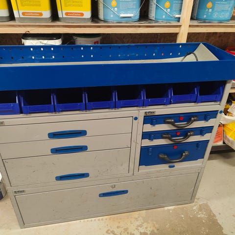 Boxo työkaluvaunu pyörillä. Sisältää useita työkaluja, kuvissa näkyy mitä sisältää. Työkalukaappi on varustettu useilla laatikoilla ja liikuteltavissa pyörien avulla.