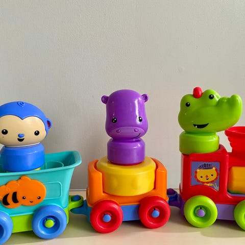 Fisher-Price lasten lelujuna, värikäs muovinen junalelu, jossa kaksi yhdistettyä vaunua. Sopii lasten leikkeihin ja kehittää motorisia taitoja.
