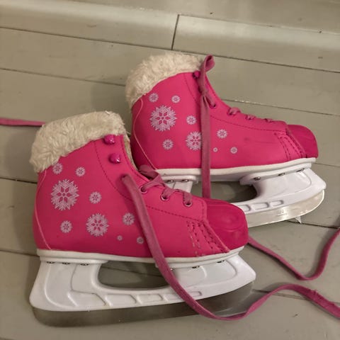 Minni lasten luistimet koko 30. Väri pinkki, koristeltu lumihiutalekuvioilla. Luistimissa valkoinen reunus ja pehmeä vuori. Pohjan pituus 20,5 cm. Kärjissä näkyy käytön jälkiä, terät hyvässä kunnossa.