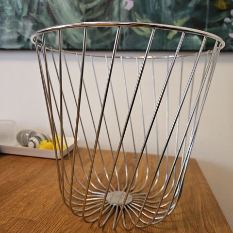 Alessi merkin kori on valmistettu metallista. Korin rakenne koostuu toisiinsa kietoutuneista metallisilmukoista, mikä antaa ilmavan ja koristeellisen ilmeen.