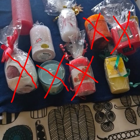 Kuvan luonnonmateriaaleista itsekoristeltuja kynttilöitä (Kotikulta merkkisiä).