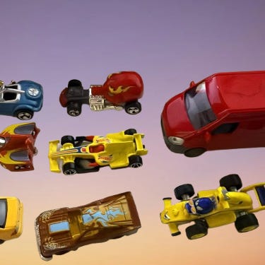 Kokovertailu. Vasemmanpuoleinen punainen auto on tavallisen pikkuauton kokoinen.