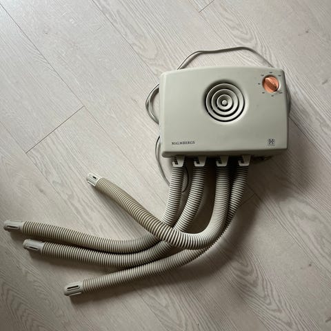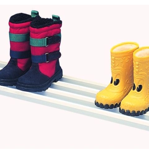 Sähköllä toimiva valkoinen kätevä vähäkulutuksinen(110w) kuivausteline esim.kengille.Lasten märät kengät ja hanskat kuivuu hyvin yön aikana.Toimii lattiallakin,mutta voidaan kiinnittää myös seinään.Mitat:Lev.115cm syv.27cm ja johdon pituus 2m.Helppo pitää puhtaana irroitettava ritilän ansiosta.