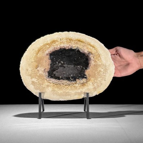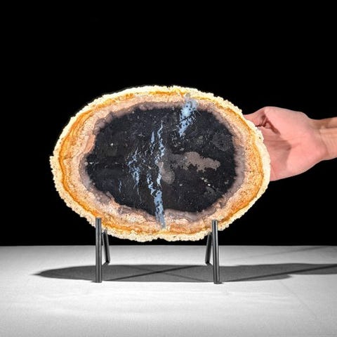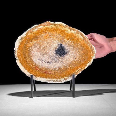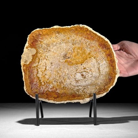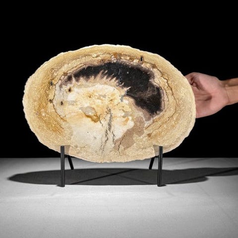 Kaunis viipale fossiilipalmun rungosta, jossa on upeita sävyjä ja tyypillinen puhkeama. Kuori on selvästi näkyvissä ulkopuolella, ja palmujen tyypillinen muodostuma erottuu keskellä. Osan sisäosasta on geodetisesti kiteytynyt. Viipale on erittäin kauniisti kiillottu, mikä tekee yksityiskohdat näkyviksi.