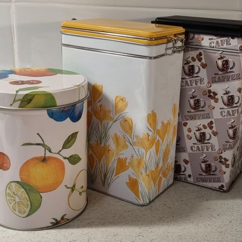 Erilaisia jouluisia peltipurkkeja yhteensä 7 kpl. Yhden purkin kannessa näkyvämpi kolhu, muuten kunto oikein siisti. Joku purkki ollut käytössä, mutta siisti.