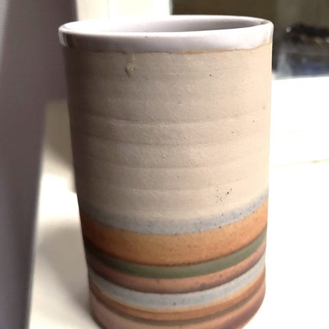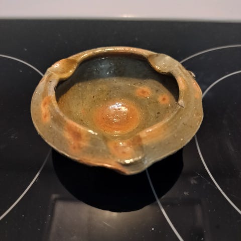 Myydään ruskea kermansaven tuikkuastia.