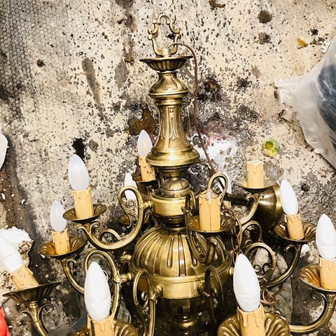 Iso (halkaisija n. 120 cm ja korkeus n. 140 cm) korkeaan tilaan hyvin sopiva näyttävä kattokruunu.