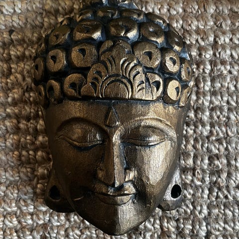 Figuurit: Kirjainten molemmin puolin on kaksi hopeanväristä Buddha-aiheista figuuria (toinen istuva, toinen "lapsi-Buddha").