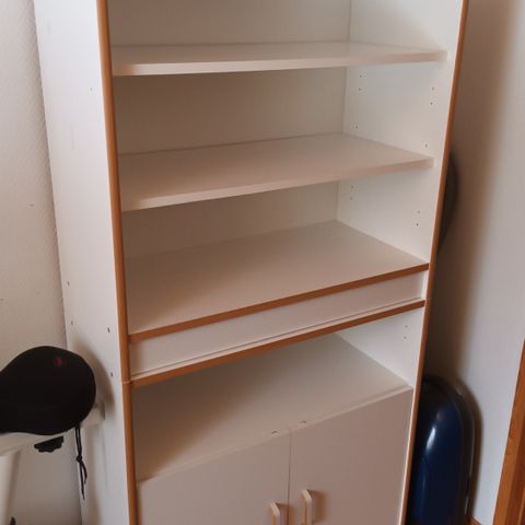 Neljä vetolaatikkoa toimivat hyvin. Kaapissa hyllykkötilaa, samoin avohyllyjä.