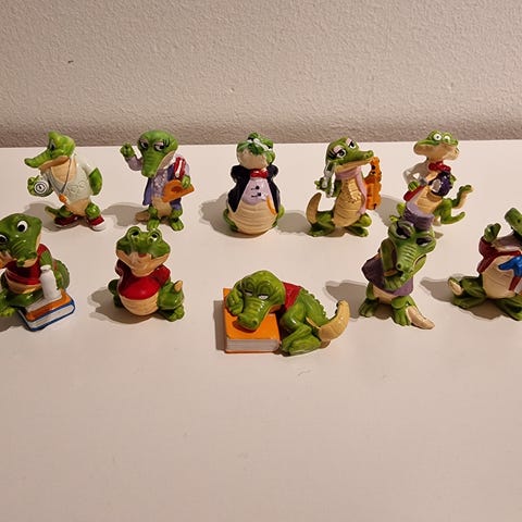 Kinder krokotiili figuuri, väri hieman kulunut. Hinta 0,50 €.