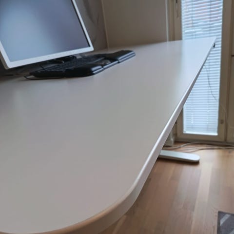 Tuttu klassikko, Ikean 2-moottorinen Bekant-sähköpöytä. Kannen koko 160 x 80 cm. Pöydän korkeus säätyy n. 66cm - 126cm . Max. kuorma 70kg. Kätevä integroitu johtoverkko pitää kaapelit kurissa! Turva-avaimen avulla voit poistaa sähkösäädön käytöstä esim. lapsia ajatellen. Käytetty, siistissä kunnossa, pieniä käytön jälkiä toki löytyy.