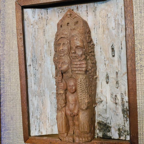 Kipsivalua käytyttäen saatu mm.pintatekstuuri, jonka pohjalle käsin muotoiltu hahmo.Koko korkeus 30 cm, leveys 25 cm, Syvyys 5 cm.Paino 1,5 kg.