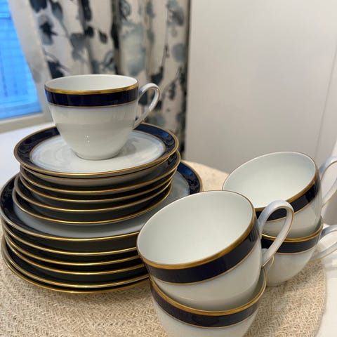 Nätti hedelmäkuvioinen astiasto. Jälkiruokalautasissa kuluma jokaisen pohjassa. Yhdessä syvässälautasessa kolhu. Yhdessä ruokalautasessa kolhu. Myyn mieluiten settinä. Painaa yhteensä 8 kg. Joissakin lautasia kolhu reunassa. Yleisilme kuitenkin siisti.