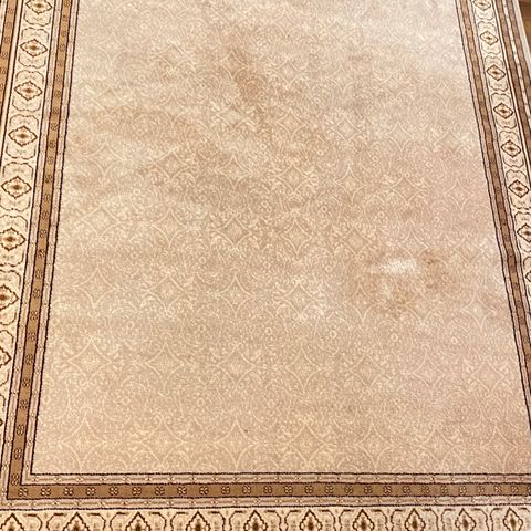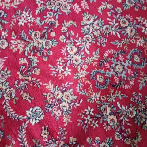 Punainen itämainen villamatto, jossa monimutkainen kuviointi ja vaaleat hapsut reunoilla. Matto soveltuu sisätilojen lattian peittämiseen ja sisustuselementiksi.