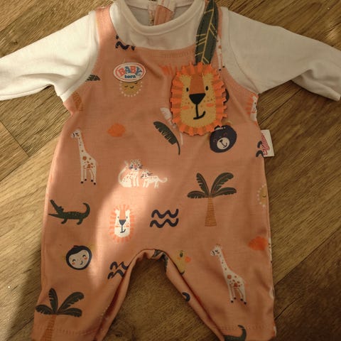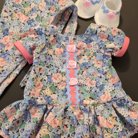 Baby born nukelle kotona ommeltu mekko ja huopatossut.