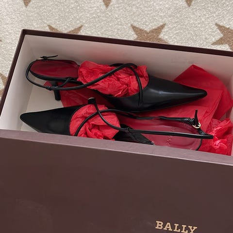 Bally nahkaiset juhlakengät, koko 37. Väri on metallinhohtoinen pronssi. Korkojen koristeena metallilistat. Kengät käyttämättömät.