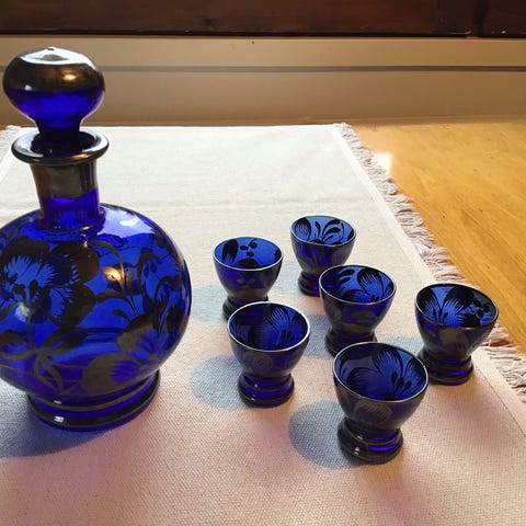 Crisyal D'Argean lyijykristallinen karahvi ja 6 kpl laseja timanttikuvioisella leikkauksella 50-60-luvulta. Viskille, viinille, brandylle. Hinta posteineen.