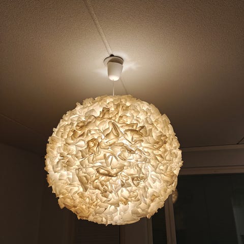 Valaisin, jossa valoa suodatetaan kerrosten välistä – tarkoitus on luoda epäsuora ja pehmeä valaistus huoneeseen. Pistoke valaisinripustusrasiaa varten mukana asennettuna.