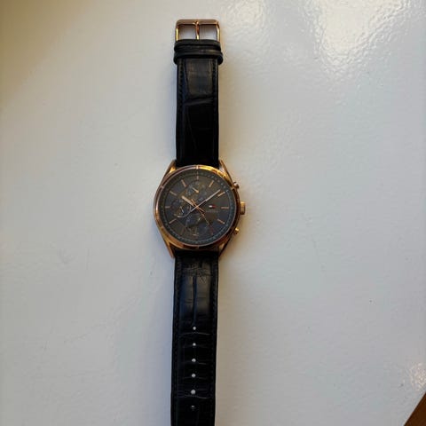 Tommy Hilfiger miesten rannekello, jossa on sininen kellotaulu ja metalliranneke. Kello sisältää ajanoton toimintoja ja päivämäärän näyttö. Toimii, vaatii vain uuden patterin. Ei koteloa tallella. Nouto.