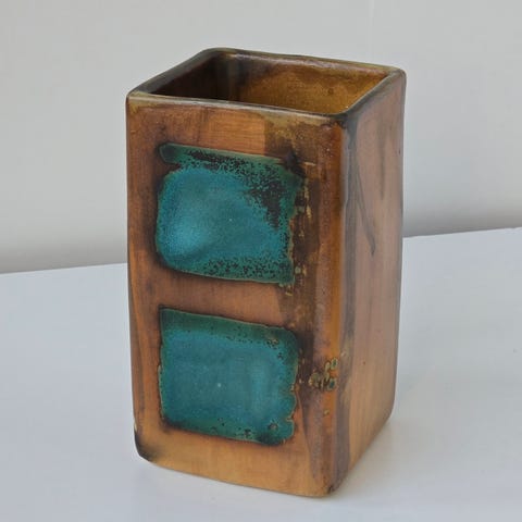 Pirjo Nylander maljakko. Korkeus n. 35 cm, leveys n. 16 cm ja syvyys n. 5 cm. Saanut osumaa ja tullut halkeama yläreunaan, mutta osa ei ole yhtään irtonainen.