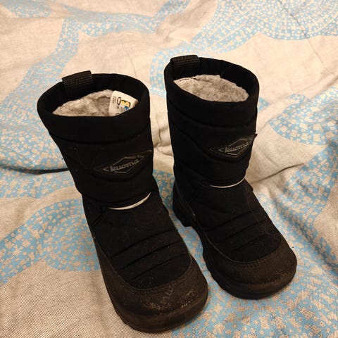 Kuoma lasten talvikengät, koko 24, musta väri, unisex. Kengissä on lämmin vuori ja paksu pohja, jotka sopivat kylmiin olosuhteisiin. Kengät on suunniteltu tarjoamaan suojaa ja mukavuutta lapsille talvikäyttöön.