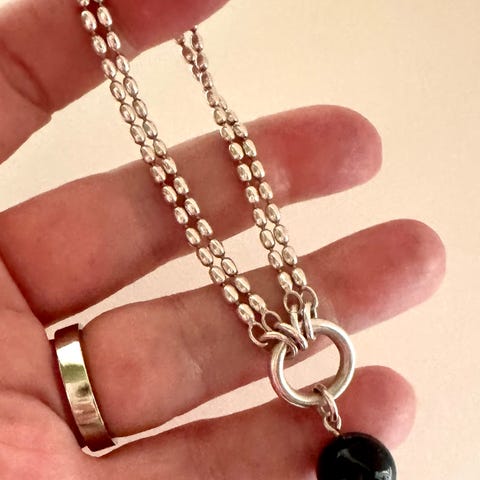 - Kaulakorun ketjun ympärysmitta 49,5 cm, riipusosan pituus 4cm, renkaan kanssa 5cm.