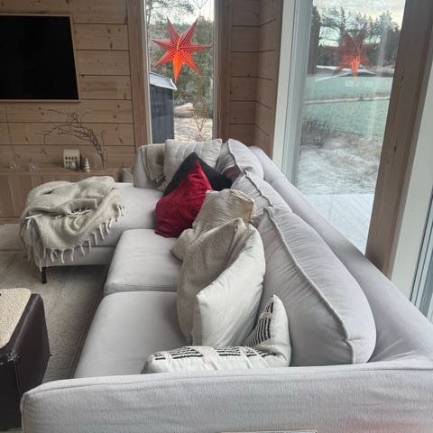 Verhoilu on Lino kangas, joka on kestävää ja paksua kangasta, rustiikkinen ulkonäkö tuo kivan ilmeen sohvalle.